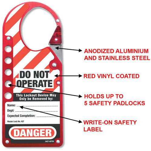 | Intitulé du produit | Crochet de consignation de groupe n°427, Largeur: 73 mm, Longueur: 178 mm, Coloris: Rouge |