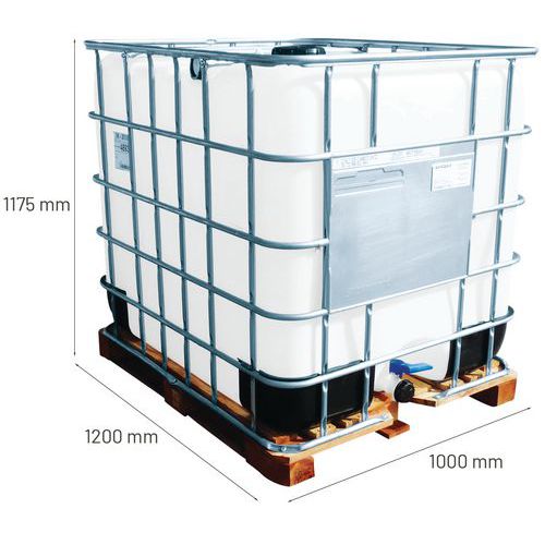 | Intitulé du produit | Cuve de transport 1000L rénovée et homologuée + palette, Capacité: 1000 L, Hauteur hors tout: 1175 mm |