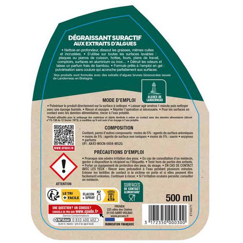 | Intitulé du produit | Dégraissant aux extraits d'algues 500 ml, Produit désinfectant: non, Conditionnement: Spray |