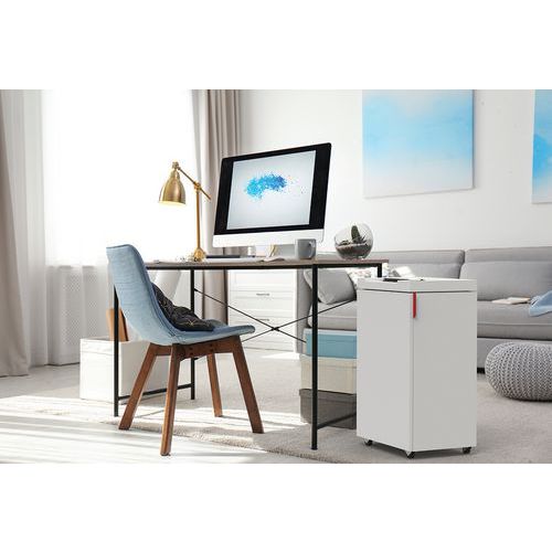 Marche/arrêt automatiques par cellule. Destructeur de papier avec bloc de coupe en acier spécial, robuste et sûr. Meuble en bois avec porte, monté sur roulettes. Réceptacle pratique avec poignée de préhension. Système d'entraînement robuste et étanche à la poussière. Idéal pour le télétravail