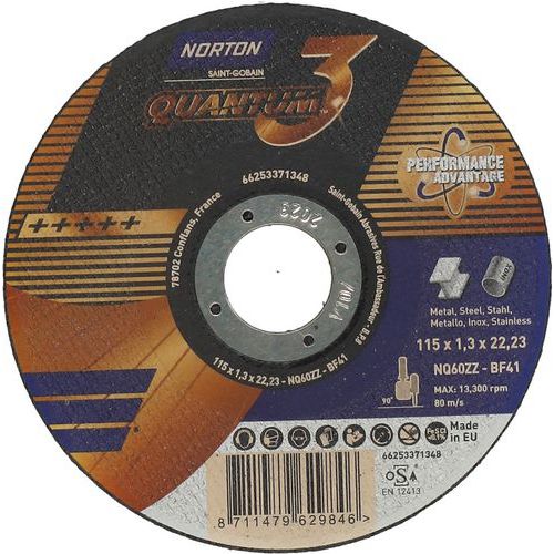 | Intitulé du produit | Disque de tronçonnage plate QUANTUM 3-METAL, Alésage Ø meule: 22.23 mm, Abrasif: Céramique, Grain: 46 |