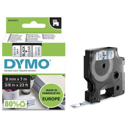 Cassette de ruban D1 largeur 9 mm, Fond coloris: Transparent, Type: S0720670, Ruban longueur: 7 m Cassette de ruban D1 largeur 9 mm, Fond coloris: Transparent, Type: S0720670, Ruban longueur: 7 m