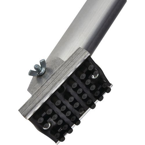 Échafaudage roulant, structure aluminium soudé, garde-corps double lisse. Plinthes rapportées amovibles en aluminium (150 mm), mise en place rapide. Platine de stabilisateur antidérapant orientable, avec décalage de niveau intégré. Roues à blocage surpuissant, réglage millimétrique sur 200 mm tous les 12.5 mm. Système de liaison breveté Ergoblock®, pour un blocage ultra fiable en 1 seul geste. Plancher de type R08 Comabi.