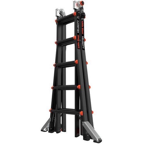 Réglage télescopique qui permet une utilisation sur un sol irrégulier et roues fixes afin de déplacer facilement l'échelle.