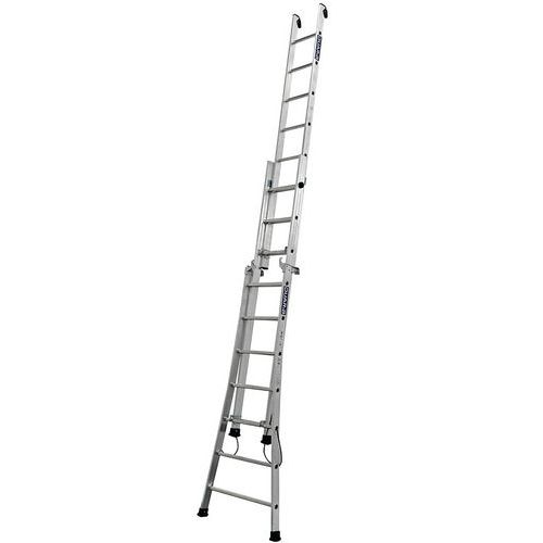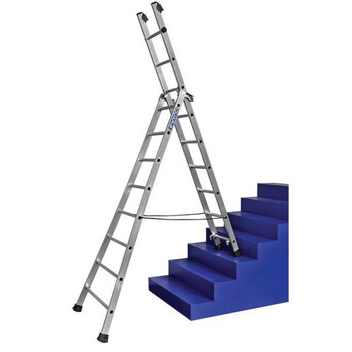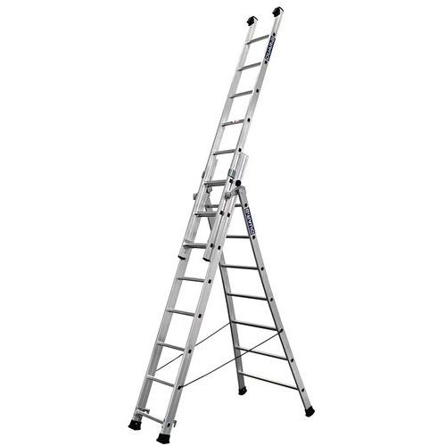 - Échelle transformable 3 plans à base évasée pour compenser les irrégularités du sol et contourner les obstacles.