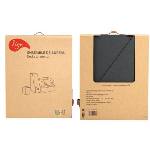 Ensemble de bureau SIGN Reborn. En papier & carton recyclés + polyuréthane. 4 pièces : Range documents, pot à crayon, corbeille à courrier A4 et classeur-lettres.