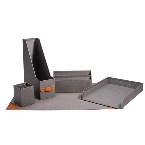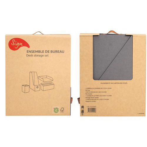 Ensemble de bureau SIGN Reborn. En papier & carton recyclés + polyuréthane. 4 pièces : Range documents, pot à crayon, corbeille à courrier A4 et classeur-lettres.