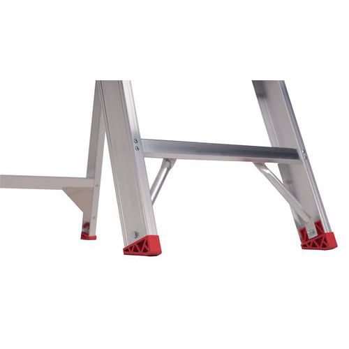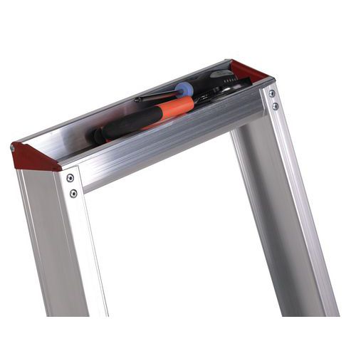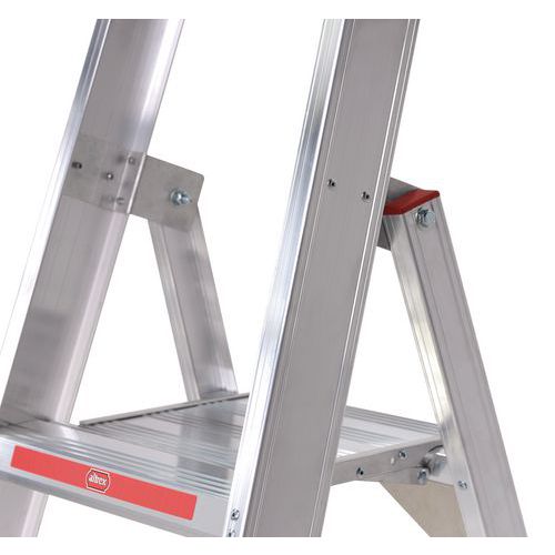 Escabeau professionnel simple accès en aluminium extrêmement léger avec des marches à profil creux. Les marches sont fixées à l’aide de rivets tubulaires. Ainsi, elles peuvent être remplacées rapidement en cas de besoin. Repliez et dépliez l'escabeau de manière rapide et aisée grâce au système de charnière auto-verrouillant sur la plate-forme.