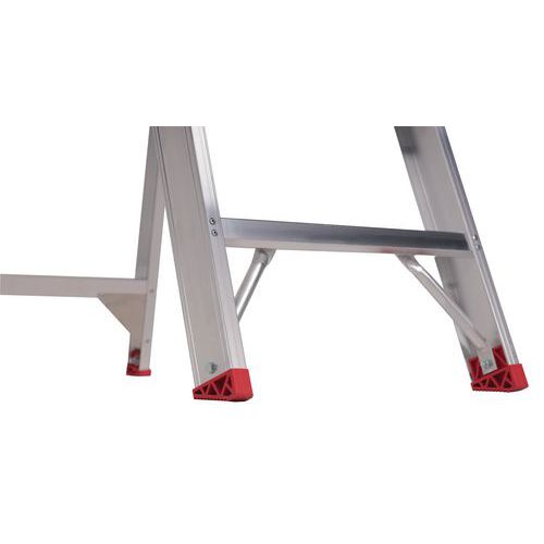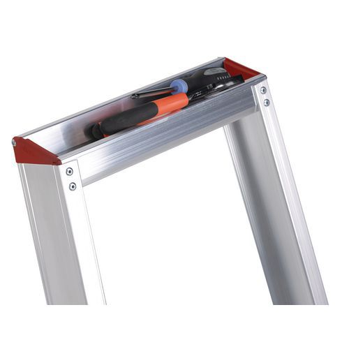 Escabeau professionnel simple accès en aluminium extrêmement léger avec des marches à profil creux. Les marches sont fixées à l’aide de rivets tubulaires. Ainsi, elles peuvent être remplacées rapidement en cas de besoin. Repliez et dépliez l'escabeau de manière rapide et aisée grâce au système de charnière auto-verrouillant sur la plate-forme.