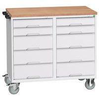Établi mobile robuste et verrouillable avec plan de travail solide en multiplis. Rangez vos affaires en lieu sûr en verrouillant les tiroirs. Stable grâce au système de blocage individuel des tiroirs avec lequel vous ne pouvez ouvrir qu’un seul tiroir à la fois. Équipé de 4 roues en caoutchouc, dont 2 roues pivotantes avec frein. Fabriqué au RU Charge maxi (kg) : 300
