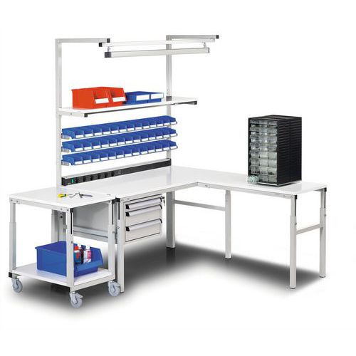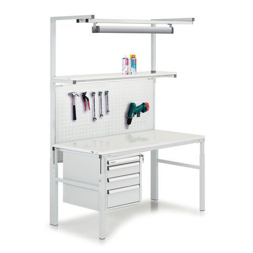 | Intitulé du produit | Établi TPH, Charge maxi: 300 kg, Largeur: 120 cm, Profondeur: 70 cm, Coloris: Gris Blanc |