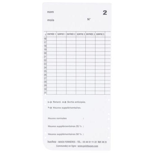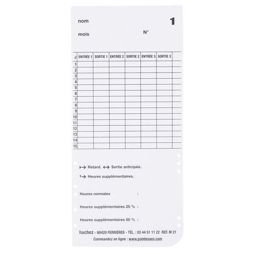 | Intitulé du produit | Fiche de pointage ER1600et ER2700, Type: Fiche de pointage, Pour modèle: Pointeuse ER 1500/2500 |