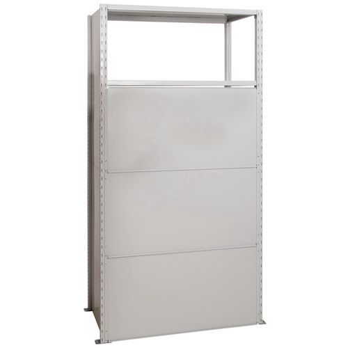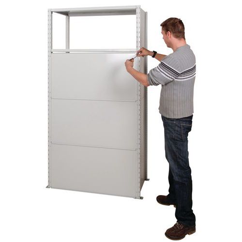 Solide panneau arrière tôle pleine galvanisée. Stabilise et renforce la structure du rayonnage. À insérer dans les montants à l’aide des crochets. Époxy gris clair, RAL 7035.