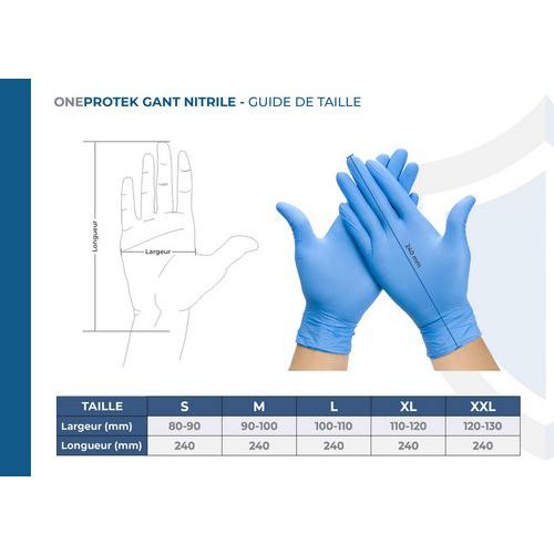 - Le gant nitrile en sachet OneProtek est ambidextre et non poudré.