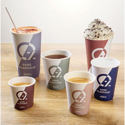 - Gobelet en carton Alpha, adapté à toutes sortes de boissons, chaudes ou froides, sauf alcool fort.