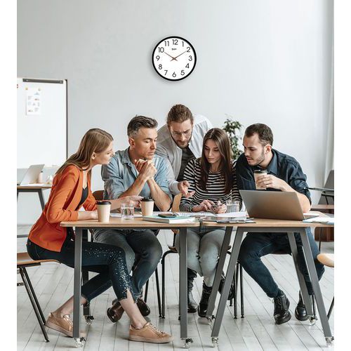 Horloge analogique éco-conçue noire, englobe un concept complet dans une démarche durable. Design pensé pour s'intégrer dans vos environnements de travail (bureaux, open space, télétravail...). Un contraste pour assurer une bonne lisibilité de loin. Mouvement silencieux pour assurer calme et concentration dans vos espaces de travail. Aiguilles en bois naturel.