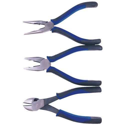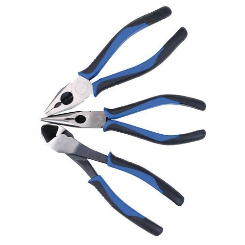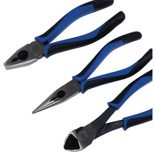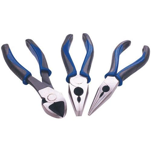 - Jeu de 3 pinces : Pince universelle 160 mm, pince coupante bec demi-rond 160 mm, Pince coupante mécanicien 160 mm.