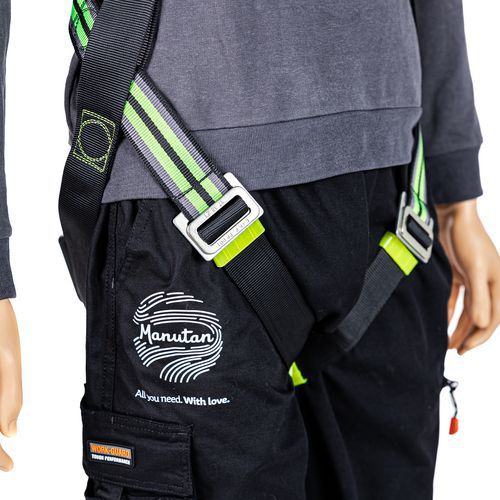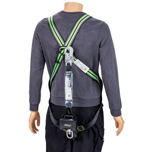 Kit composé de 1 harnais, 1 mousqueton acier verrouillage à vis, 1 anneau d'ancrage longueur 1,20 m, 1 antichute à rappel automatique en sangle longueur 2,5 m, 1 sac de transport.