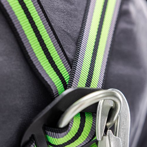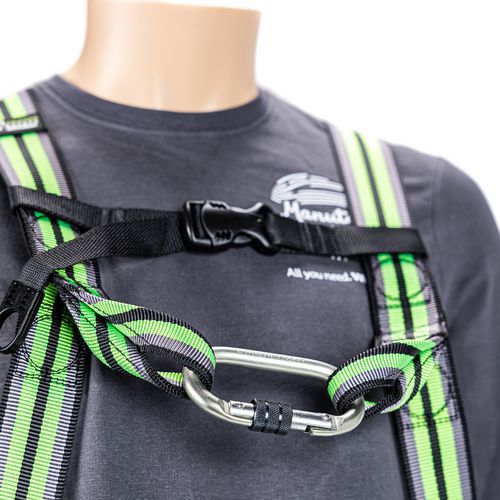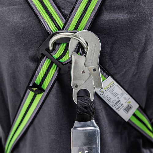Kit spécialement conçu pour la maintenance industrielle avec harnais, mousqueton, anneau d'ancrage et antichute à rappel automatique en sangle.
