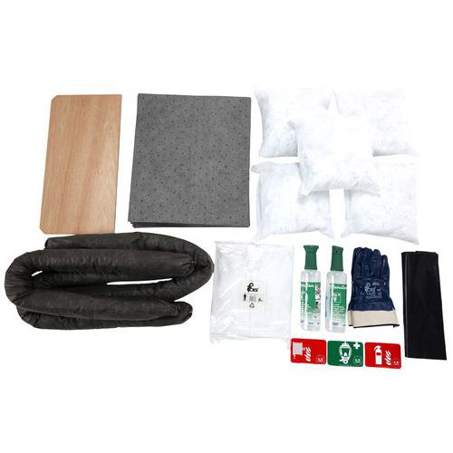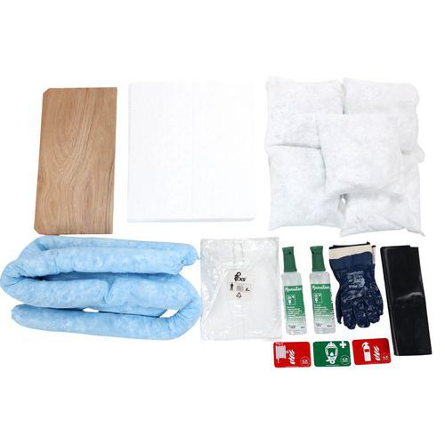 Contient: 30 feuilles d'absorption, 5 coussins, 3 boudins, 1 paire de gants de protection, 1 combinaision de protection à usage unique, 2 flacons lave-oeil 500 mL et 2 sacs de récupération des déchets.