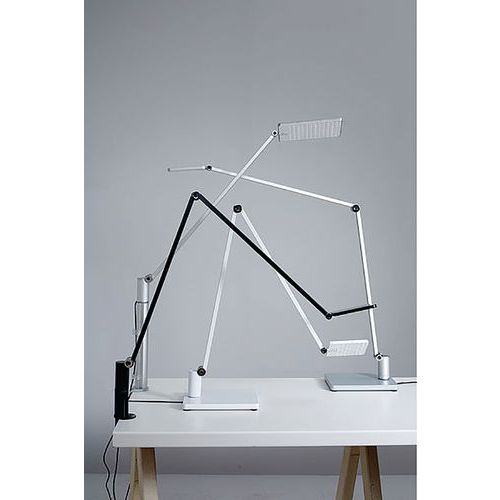 Lampe de bureau à LED au design très fin avec un élégant bras articulé en aluminium à 2 éléments et passage des câbles invisible. Socle en pince. Longueur du câble d'environ 2 m. Teinte de la lumière : blanc chaud (température de couleur 3 000 K) Fabriqué en Allemagne
