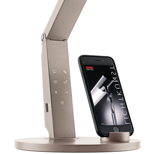 - Selon besoin le support aimanté pour les appareils mobiles peut être attaché au pied de la lampe.