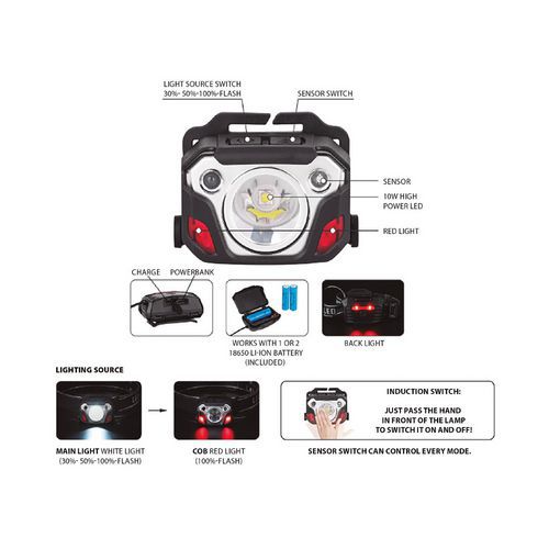 La sélection se fait par l'interrupteur en caoutchouc ou via le capteur mains libres qui vous permettra d'allumer/éteindre la lumière frontale sans la toucher.