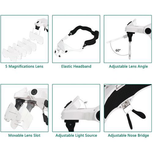Loupe professionnelle possédant 5 objectifs interchangeables: 1.0X, 1.5X, 2.0X, 2.5X, 3.5X., idéale pour le modélisme, réparation de montres, broderie, dentiste, petits travaux miniatures.