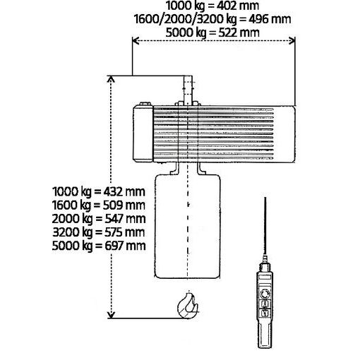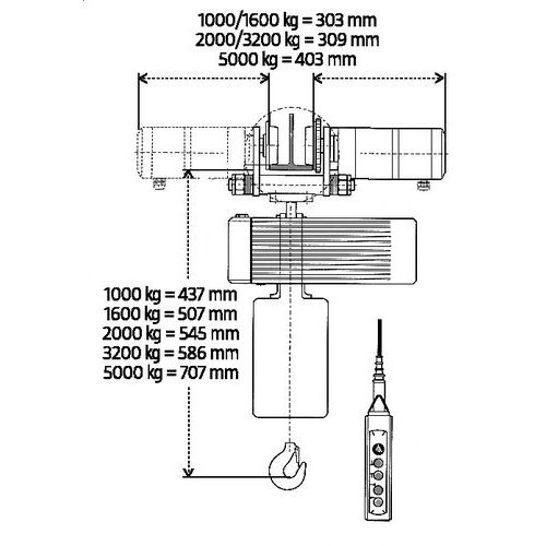 Longueur de chaîne maximale 25 m, chaîne plus longue sur demande. Disponibles en option : alimentation 230 V triphasée, pour le palan ou pour le palan et le chariot.