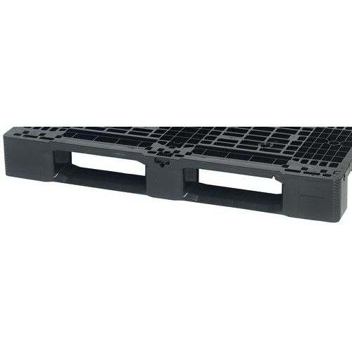 Palette plastique durable moulée en 1 seule pièce en PEhD recyclé. Palette non poreuse, pas de rétention de liquides. Nettoyage soigné et sûr avec structure ouverte. Palette entreposable sur rack à palette classique.