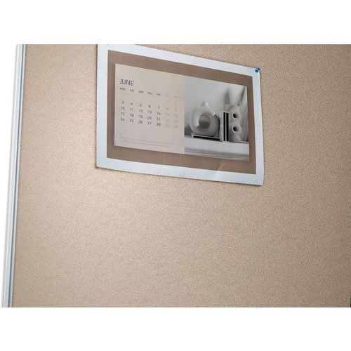 Tableau d'affichage textile punaisable. Surface haute qualité 100 % recyclée. Large éventail de coloris pour le fond. Matériau aluminium anodisé de qualité. Pourtour avec profils et coins plastique. Entretien aisé. Résiste au feu.