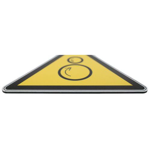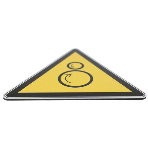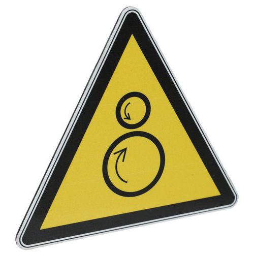 - Ce panneau avec pictogramme est donc particulièrement adapté, indiquant un danger lié aux rouleaux contrarotatifs.