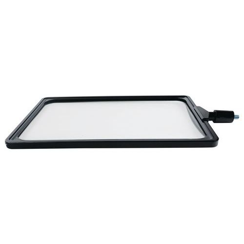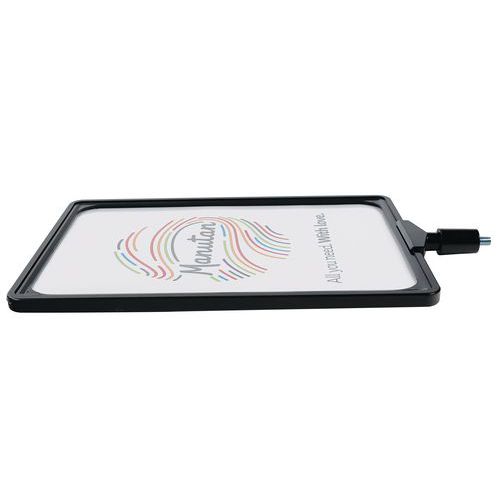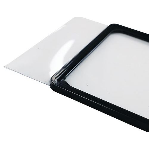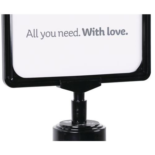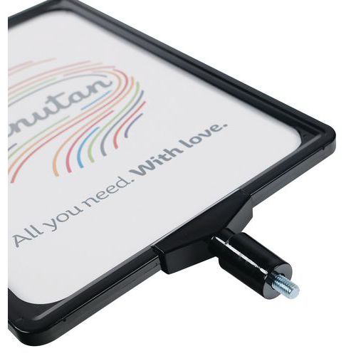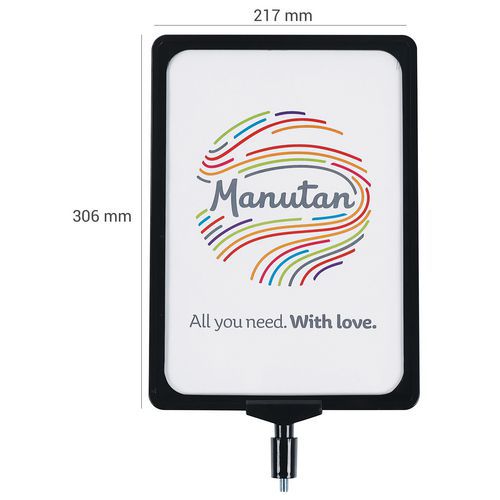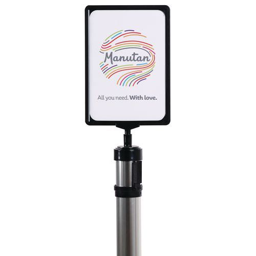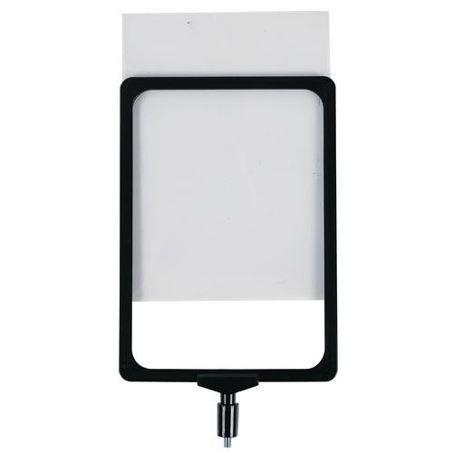 - Porte-affiche A4 avec cadre suspendu recto/verso de coloris noir qui se fixe facilement sur la tête d'un poteau de guidage à sangle Manutan.