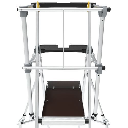 Plate-forme de travail Sherpamatic. Garde-corps rigide 4 côtés avec lisses de protection antichute arrière à fermeture semi-automatique. Marches antidérapantes 80 mm. Porte-outils compartimenté amovible, résistance 25 kg, avec crochets intégrés (maxi 10kg). Tablette XL résistance 25 kg Stabilisateurs rétractables à réglage millimétrique. Plancher grand confort 590 x 400 mm antidérapante en aluminium. Espace de travail ergonomique et confortable. Roues de déplacement tout-terrain Ø175 mm.
