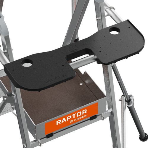 Plate-forme double tablette Raptor. Garde-corps rigide 4 côtés avec lisses de protection antichute à fermeture semi-automatique. Marches antidérapantes de 80 mm. Porte-outils compartimenté amovible, résistance 25 kg, avec crochets intégrés (maxi 10kg). Tablette XL résistance 25 kg. Plancher 500 x 400 mm antidérapant en bois éco-sourcé. Espace de travail ergonomique. Stabilisateurs rétractables à réglage millimétrique.