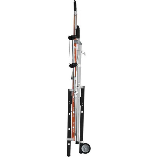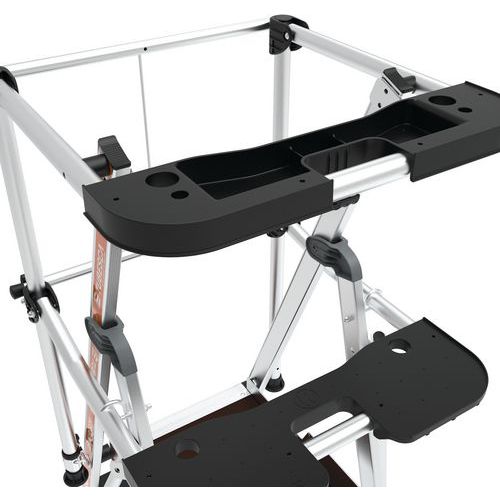 Plate-forme double tablette Raptorscopic. Garde-corps rigide 4 côtés avec lisses de protection antichute à fermeture semi-automatique. Marches antidérapantes 80 mm (plan fixe) et 60 mm (plan télescopique). Porte-outils compartimenté amovible, résistance 25 kg avec crochets intégrés (maxi 10kg). Tablette XL résistance 25 kg. Plans télescopiques permettant le décalage de niveau. Système de réglage de la hauteur intuitif et sécurisé, réglage tous les 23 cm. Plancher 500 x 400 mm antidérapant en bois éco-sourcé. Espace de travail ergonomique. Stabilisateurs rétractables à réglage millimétrique.