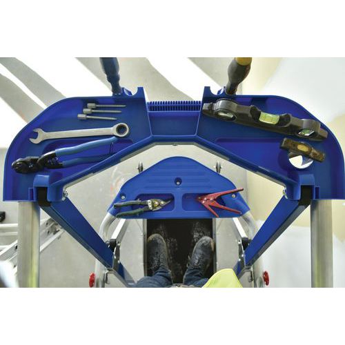 Plate-forme individuelle fixe autostable nouvelle génération en aluminium. Installation rapide et aisée avec mise en place des garde-corps en 1 seul geste. Haute sécurité avec protection arrière par garde-corps articulé et accrochage automatique. Plate-forme confortable et efficace avec 2 tablettes en série à compartiments. Marches largeur 80 mm pour un accès ultra confort.