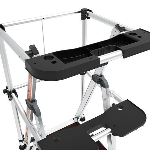 Veloce Lisses est la référence des plate-formes individuelles de travail. Légère, compacte et ultra-mobile, cette plate-forme se glisse partout sur les chantiers. Sécurité maximale : Veloce répond à toutes les exigences de sécurité françaises et européennes. Confort de l'utilisateur : cette plate-forme est munie de deux tablettes amovibles. La tablette basse résiste à 25 kg et dispose d'un espace pensé pour accueillir aisément des fûts de peintures ou du gros matériels. Garde-corps rigide 4 côtés avec lisses de protection antichute à fermeture semi-automatique. Roues escamotables 75 mm pour une mobilité rapide et optimale. Marches antidérapantes 80 mm. Porte-outils compartimenté amovible, résistance 25 kg, avec crochets intégrés (maxi 10kg). Tablette XL résistance 25 kg. Plancher 500 x 400 mm antidérapant en bois éco-sourcé avec verrou automatique. Espace de travail ergonomique. Stabilisateurs rétractables à réglage millimétrique. Roues de transport Ø 100 mm (2 à 6 marches), Ø 175 mm pour le 7 marches.