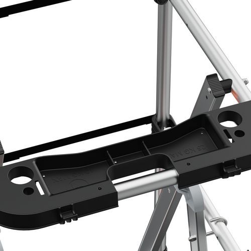 Plate-forme reglable Raptorcopic. Garde-corps rigide 3 côtés avec sangles de protection antichute arrière. Marches antidérapantes 80 mm (plan fixe) et 60 mm (plan télescopique). Porte-outils compartimenté amovible, résistance 25 kg, avec crochets intégrés (maxi 10kg). Plans télescopiques permettant le décalage de niveau. Système de réglage de la hauteur intuitif et sécurisé, réglage tous les 23 cm. Plancher 500 x 400 mm antidérapant en bois éco-sourcé. Espace de travail ergonomique. Stabilisateurs rétractables à réglage millimétrique.