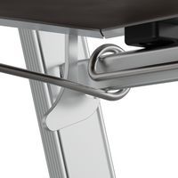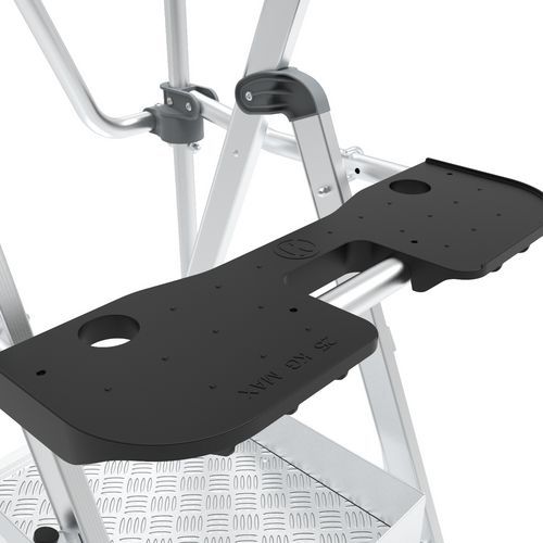 Plate-forme Sherpascopic Saloon. Garde-corps rigide 4 côtés avec portillon type Saloon à fermeture automatique. Marches anti-dérapantes 80 mm (plan fixe) et 60 mm (plan télescopique). Porte-outils compartimenté amovible, résistance 25 kg, avec crochets intégrés (maxi 10kg). Tablette XL résistance 25 kg. Plancher grand confort 590 x 400 mm antidérapant en aluminium. Espace de travail ergonomique et confortable. Stabilisateurs rétractables à réglage millimétrique. Système de réglage de la hauteur intuitif et sécurisé, réglage tous les 23 cm. Plans télescopiques permettant le décalage de niveau.