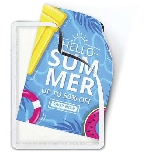 Pochette cadre adhésive avec impression double face, design en pointillés. Fermeture par 3 bandes adhésives : tenue parfaite du document. Affichage double face sur vitre grâce au cadre recto verso. Utilisation double orientation : portrait ou paysage. Pochette spécifique aux grands formats.