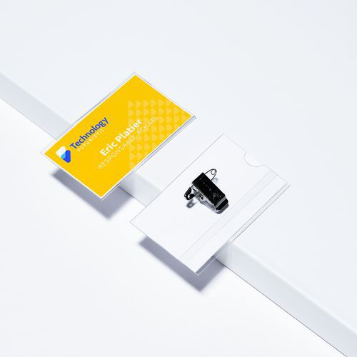 Ils sont fournis avec des inserts personnalisables (90 x 54 mm) suffisamment grands pour insérer votre logo, le nom et la fonction du visiteur, le nom de l'événement.