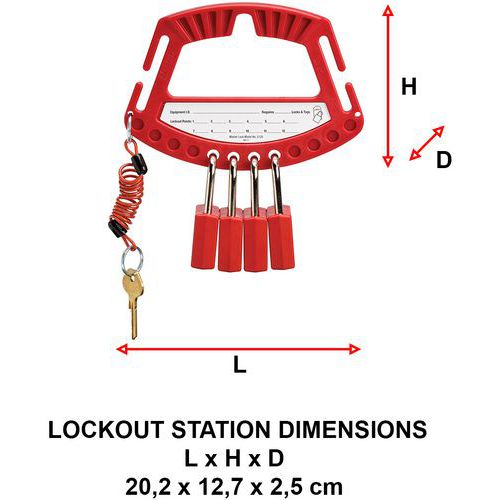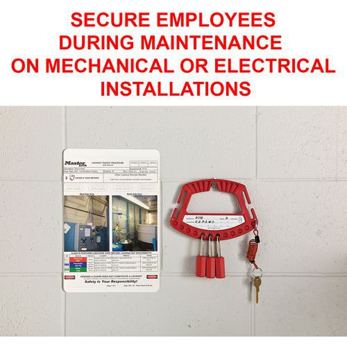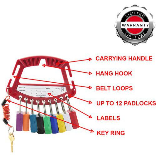 Peut contenir jusqu'à 12 cadenas de consignation et inclut des étiquettes d'identification en anglais, espagnol et français.