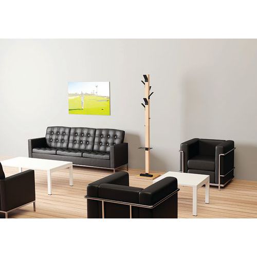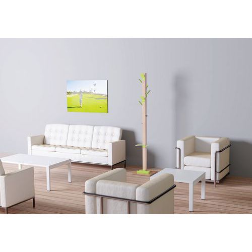Composition : 6 patères polystyrène choc haute résistance, 2 patères acier chromé, fût hêtre massif section 60x60 mm, socle pied contreplaqué 35x35 cm, épaisseur 20 mm.