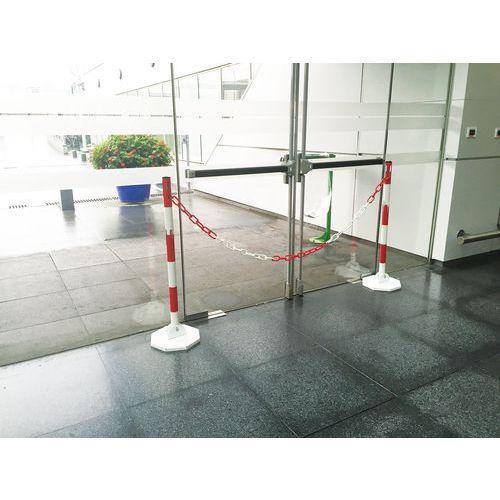 Poteau vendu sans chaîne, pensez à en commander. Vous pouvez également commander des bouchons supports supplémentaires si vous souhaitez positionner un panneau sur le poteau.