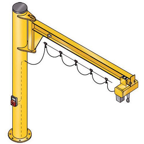 Prévoir du matériel de manutention pour décharger le produit du camion s’il n’y a pas quai de déchargement. Pour toutes les potences avec une force ou une hauteur de levage supérieures : contactez-nous. Pour une fixation conforme à la réglementation en vigueur, il vous faut commander les kits d'ancrage d'origine que nous vous proposons en accessoire. Pour éviter la réalisation d’un massif d’ancrage (potence de force 250 kg uniquement), nous pouvons fournir sur demande la potence avec une embase spéciale et des chevilles chimiques s’il existe une dalle en béton qualité 23 MPa d’une épaisseur de 200 mm au moins. Disponible en option : palan électrique DEmag DC.Com avec chariot porte-palan, 2 vitesses, hauteur de levage 4 m, alimentation 400 V, commande basse tension 24 V, cordon d’alimentation sur câble de guidage en acier de 2 à 5 m de long.