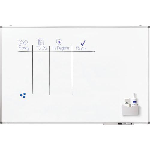Surface en acier laqué. Surface pour écrire avec marqueur. Cadre en aluminium avec coins en plastique gris foncé. Porte-marqueurs de 30cm. Fixation murale aisée avec fente dissimulée. Possibilité de montage horizontal ou vertical. Fourni avec matériel de montage, auget et marqueur.