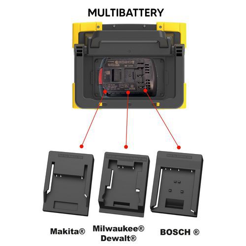 Rechargeable est compatible avec différentes batteries 18V (jusqu'à 12Ah) des principaux fabricants d'outils électriques : Bosch, Dewalt, Makita et Milwaukee.