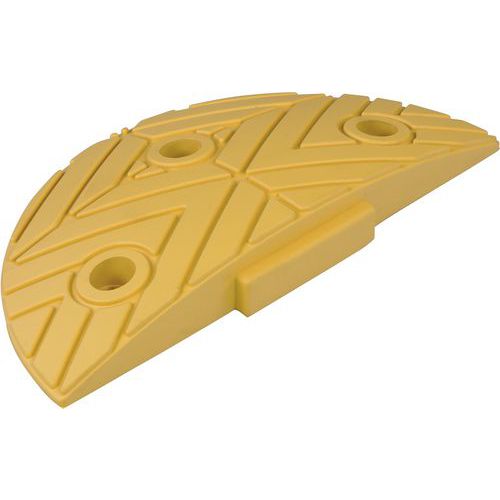Ralentisseur conseillé pour une viteste maximale à 20 km/h. Système modulaire à composer soi même avec une pièce de départ et de fin ainsi que d'une ou plusieurs pièces centrales. Fabrication en caoutchouc résistant aux températures négatives. Adapté au passage de poids lourds. Combinaison de couleurs jaune et noir.