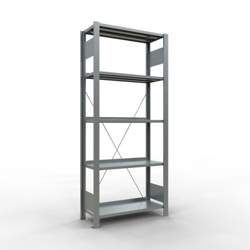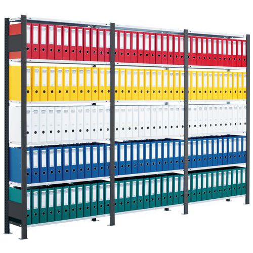 Rayonnage bureau de belle finition pour charge légère. Tablette pleine tôlée pour toutes natures d'objets. Montant plein tôlé sans perforation face avant. Barre de butée pour éviter la chute des objets. Pied de protection pour préserver les sols. Montage sans outils, par système de clip.